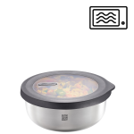 container incl. lid microwave-safe thanks to special lid valve (when valve open) – container must not come into contact with the sides of the microwave oven and must not be used with a metal turntable