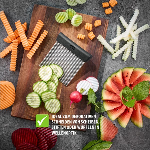 RIFFL – the clever solution for creative ridged cutting in the kitchen. Whether for homemade chips, ridge-cut crisps or decorative vegetable platters – the wave cutter gives dishes a stylish wavy look in no time at all thanks to its special stainless steel blade.