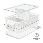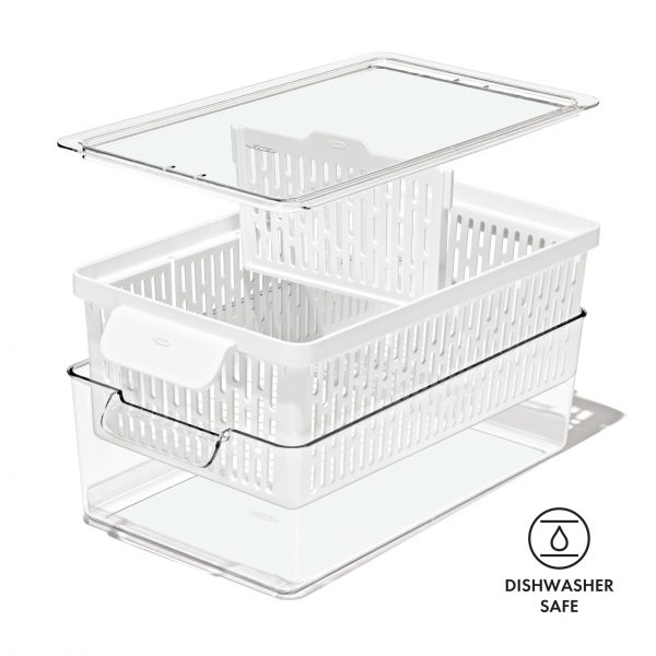 The OXO Produce Savers are fridge-friendly storage bins designed to keep your produce fresh longer. The Medium Bin is the perfect size for leafy greens, peppers, grapes, and other fruits and veggies. The adjustable divider keeps produce organized and visible, which helps reduce food waste – no more finding a forgotten rotten veggie in the back of the fridge. The inner basket keeps produce elevated and promotes optimal air circulation to keep things fresh, and the basket is removable so you can use it to rinse produce. The Bin’s comfortable handle makes it easy to take the Bin to the counter, and the pivoting lid provides access whether you’re opening it in the fridge, or on the counter during prep. The Medium Bin measures 13.8 in x 7.4 in x 4.7 in/35.1 cm x 18.9 cm x 11.8 cm; this BPA-free Bin is dishwasher safe and stacks with other OXO Produce Savers for modular, customizable organization.