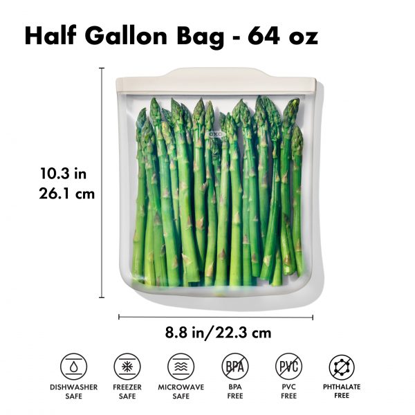 A new take on keeping food fresh at home or on the go that’s kinder to the planet too. Our OXO Good Grips Reusable Silicone Bag assortment replace single-use plastic and is so durable, versatile and easy to clean, they will quickly become your new go-to solution for better food storage. The flat size bags are easy to stack in the fridge or freezer for compact storage, and slip easily into totes and backpacks for on-the-go needs. The standing bags sit upright, making them a perfect companion for grazing snacks or use them to reach in and out while measuring out dry ingredients such as nuts and chocolate chips will baking. Each bag is made of food-grade silicone with a seamless construction. What does that mean? No seams make them more durable and the bags can easily be turned inside out for thorough cleaning. Pop them in the dishwasher or wash by hand to effortlessly scrub away any rogue, stuck-on food bits hiding in the corners or on the seal. Our Reusable Silicone Bags also have a unique dust-resistant finish to help repel unwanted dust and debris from sticking to the surface. This helps keep your bags clean and also give them feel good texture that’s comforting when fumbling around for them in a work tote, gym bag or backpack. What’s more, our Reusable Silicone Bags each have a secure closure to keep food fresh and prevent leaks, so you can feel confident toting your juicy pineapple, watermelon or a brothy pasta to work or marinating kabobs in the fridge without worry. The closer has a generous-sized tab for easy opening and closing and the bags open wide for fumble-free filling. Available in a variety of sizes and in our Oat, Lagoon and Watermelon colors, our Reusable Silicone Bags are designed to suit all your food storage needs and beyond. Use them to store foods at home or taking lunch and snacks on the go or use them to reheat leftovers—they are both microwave safe. The Half Gallon and Gallon bags are great for use with sous vide recipes, sealing in all the flavor and ingredients while cooking. These versatile bags are great beyond food too! We love them for toting and storing travel and makeup essentials. Load them up with your passport, cell phone charger, sleep mask and chewing gum for your next plane trip or pile in your post-workout essentials like face wipes, deodorant, hair ties and makeup. With so many sizes and uses, the possibilities are endless! Available in five flat sizes: Snack Bag (12 oz); Sandwich Bag (28 oz); Slim Bag (30 oz): Half Gallon Bag (64 oz); and Gallon Bag (128 oz and four stand-up sizes: Snack (12 oz); Stand-Up Quart (32 oz): Stand-Up Half Gallon (64 oz); Stand-Up Cup (8 oz). Also available in two sets: 4-Piece Lunch Set and 4-Piece Starter Set.