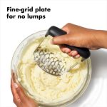 This innovative Potato Masher puts less pressure on your hands while churning out smooth, soft mashed potatoes. A broad, soft, horizontal handle lets you press straight down as it absorbs pressure. A fine-grid, stainless steel mashing plate yields smooth mashed potatoes with no lumps.
