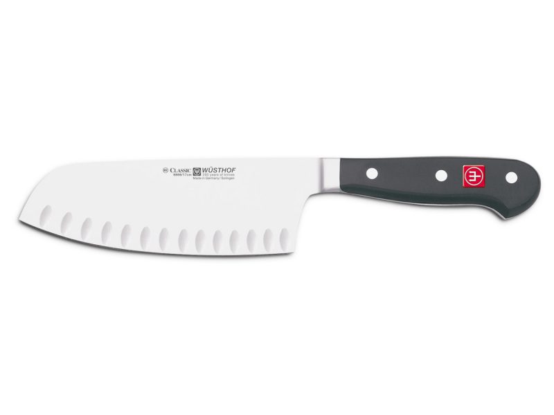 The WÜSTHOF Classic 7″ Hollow-Edge Chai Dao combines the shape of a Santoku with that of a Chinese chopping knife. However. it adopts not only the form. but also the functionalities of the two models. Thanks to the slightly curved shape of the blade. the Chai Dao is suitable for both cutting and chopping. especially for a fluid rock-chop. As this knife is particularly finely ground towards the cutting edge it should not be used for chopping bones; instead we recommend our European Cleaver or Butchers Knife.