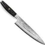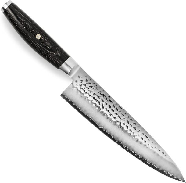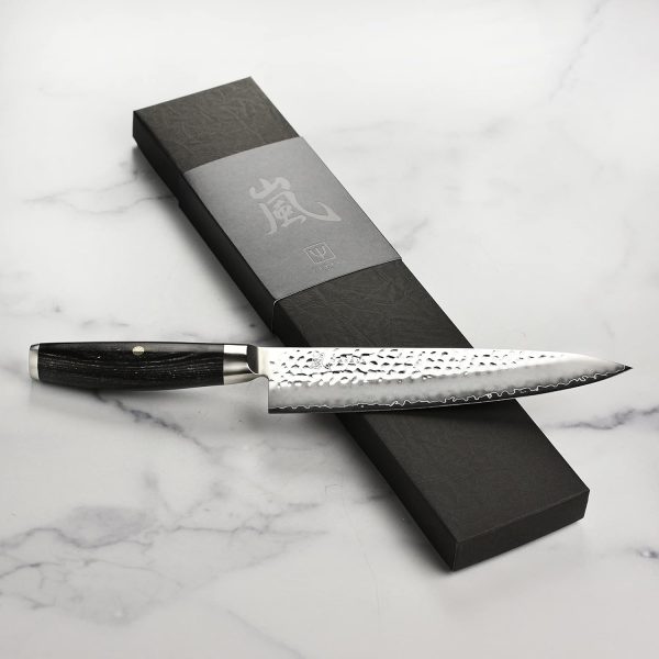 Stunning tsuchime (“hammered”) blade finish enhances food release, while the hand-sharpened highly polished edge (12 degrees, even double bevel) ensures razor sharpness right out of the box
