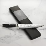 Handcrafted in Seki, Japan using high-performance SG2 powder stainless steel – Exclusive to Japan, SG2 steel is produced using powder metallurgy resulting in a very fine microstructure that allows for further hardening without sacrificing toughness